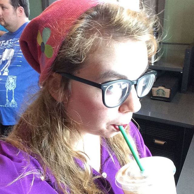 Sometimes Mugsi sneaks out of the alley to walk amongst the commonfolk and make an actual purchase instead of stealing. Also, my @whositswhatsits Bing Bong hat covers beret-hair nicely. #whositswhatsits #thelittlestmugsi (at The Trolley Car Café)