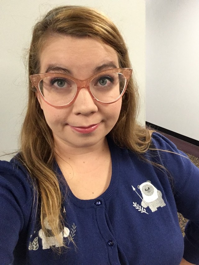My big solo number…was a song I’d never heard before. I’ve listened to a lot of musical theatre, trust me, but I’d never heard of this song. And it was a challenging one for me, because by the end of the song I was supposed to unbutton my nerdy Her Universe Ewok cardigan and show off my (very modest, very unrevealing) bra to the audience. (I thought I was too shy and retiring to show off my bra to an audience. And then two months later, Evil Dead…)