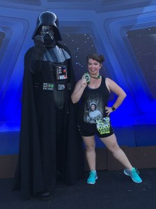 The princess race turned out to be a lot of fun. Like all Disney races, costumes are encouraged, so I bought an XL Elsa children’s costume from Cast Connection and took it apart. I decorated a teal running tank from Forever 21 with silver glitter paint to look like Elsa’s bodice and sewed the cape from the costume to the back, then made a new waistband for the costume skirt to make it a separate piece. I added gray running leggings and braided my weave into my hair with some sparkly Elsa snowflakes from the Disney store, and it ended up pretty cute! My time wasn’t great, but I had a magical time running the race and was so excited for Star Wars.