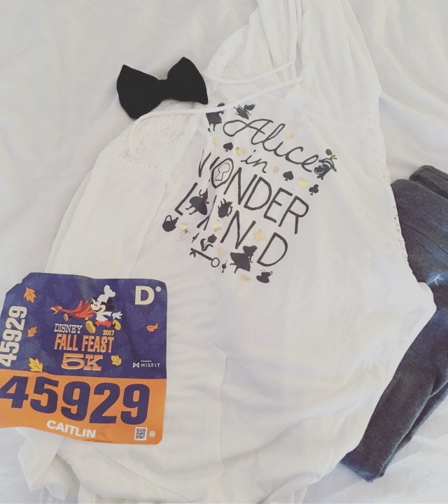 I didn’t bother with a costume, since it was going to be pretty cold out for Florida; we were in the middle of a cold snap and it was in the upper 40s-early 50s. I bought a cute Alice in Wonderland top with long sleeves and a hood from Walmart, along with a pair of my favorite Danskin capris in gray. In the end I was glad I didn’t dress up- at least half of the people there weren’t in costume, unlike the Princess and Star Wars races.